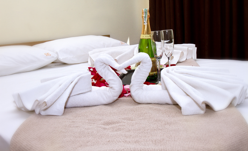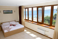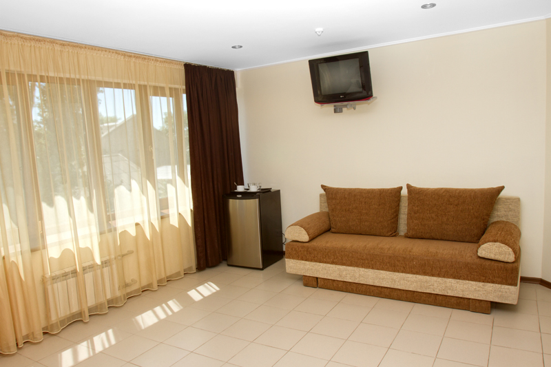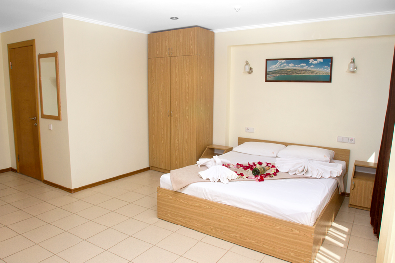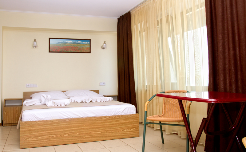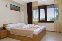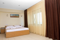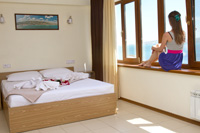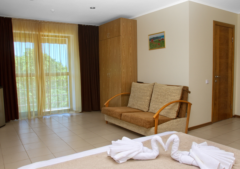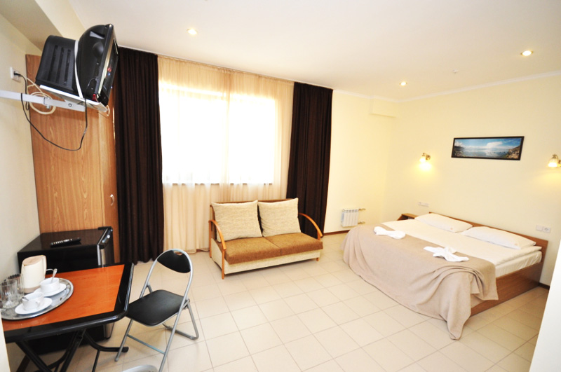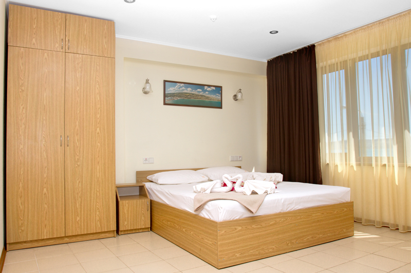 Номер оформлен в светлых тонах, что придает ощущение объема, легкости, пространства и света. В номере все создано для обеспечения удобного пребывания в нем: комфортная двуспальная кровать, уютный раскладной диван, большие окна с видом на море. Средняя площадь номера — 26 м.кв. Максимальное число гостей номера — четыре (два основных места и два дополнительных).